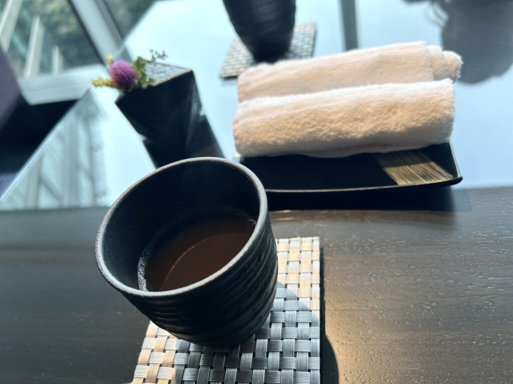 11階の専用ラウンジに到着し、ソファに腰掛けるとウェルカムドリンクに禅オリジナルの『飴湯』と温かいおしぼりが出されてきました。