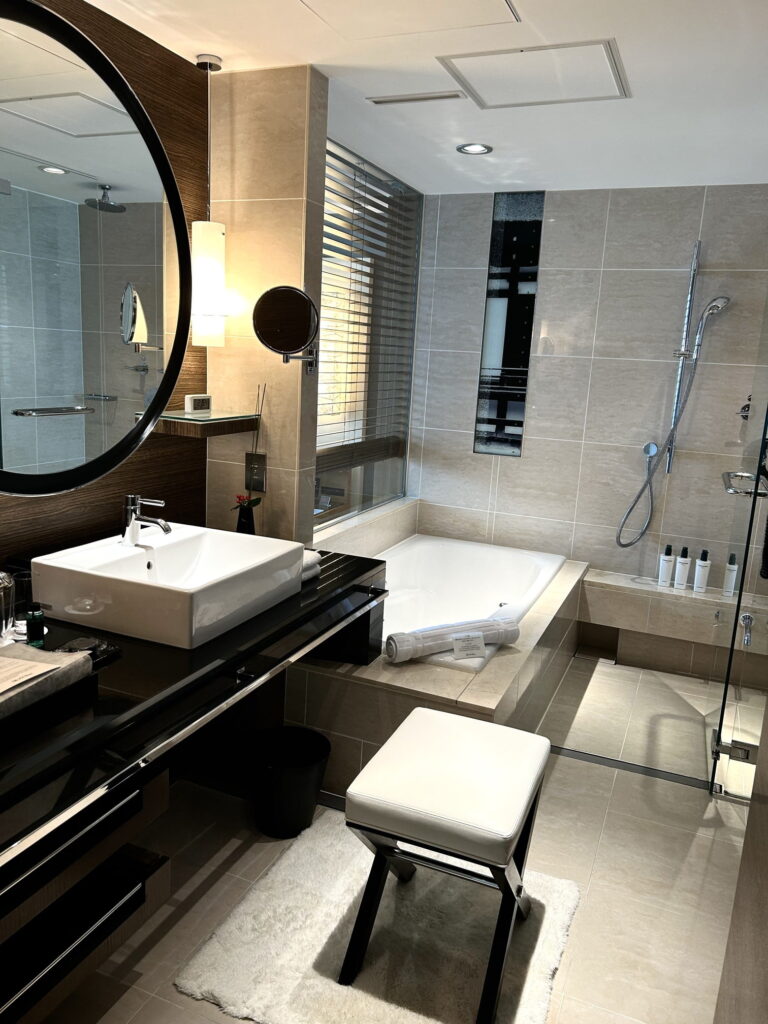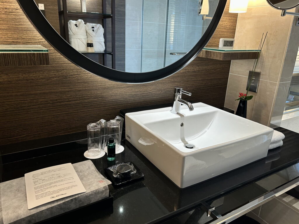 ドアを開けた瞬間に広がるのは、墨色と金色を基調とした「和」のモダン空間。広さ約45〜50平米のデラックスダブルは、ただ広いだけでなく、細部にまで「おもてなし」が詰まっていました。