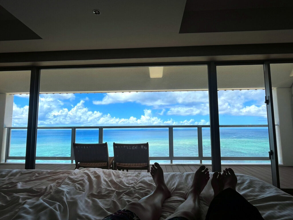 部屋で一番目を惹いたのはやはりベッドでしょうか。ダブルベッドが二つ並んで、目の前はオーシャンビュー。