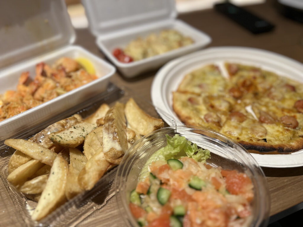 部屋での夜食用で「牛ハラミのファヒータ-ピザサンド-レッドキャニオンポテト」をテイクアウトしました。