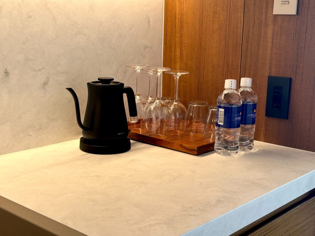 こちらも全てのクラスに共通でワイングラスやお水が備え付けられています。
